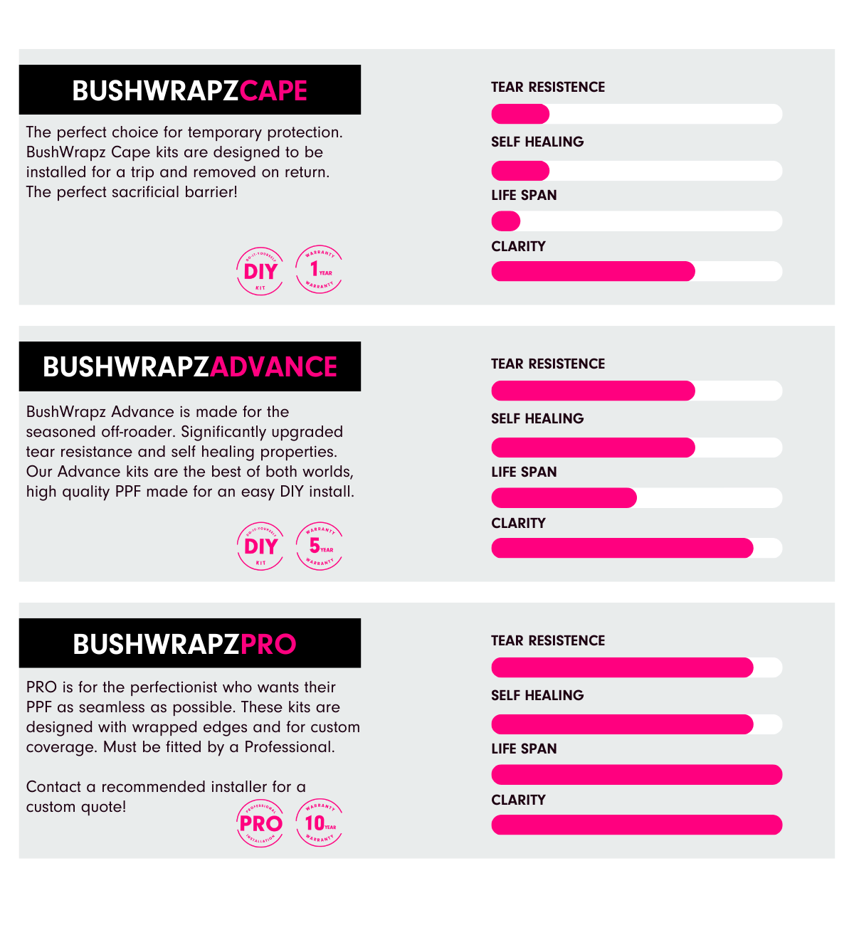 We are an authorised installer of Bushwrapz Paint Protection Film, trusted for its quality, durability, and performance.